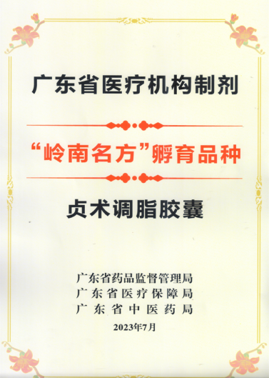 我院總結(jié)郭姣教授多年臨床經(jīng)驗(yàn)方,制定院內(nèi)協(xié)定處方進(jìn)行名醫(yī)經(jīng)驗(yàn)推廣。2023年,院內(nèi)中藥制劑“貞術(shù)調(diào)脂膠囊”獲得“嶺南名方”孵育品種稱(chēng)號(hào)。